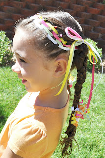 Pick out your favorite ribbons or coordinating ribbons for this hairstyle.  You're going to also need a thick plastic (usually light blue) yarn needle.  (Usually found in the yarn section at your local craft store or Wal Mart.)  You may also want some colored elastics like we've used, or you can use clear ones.